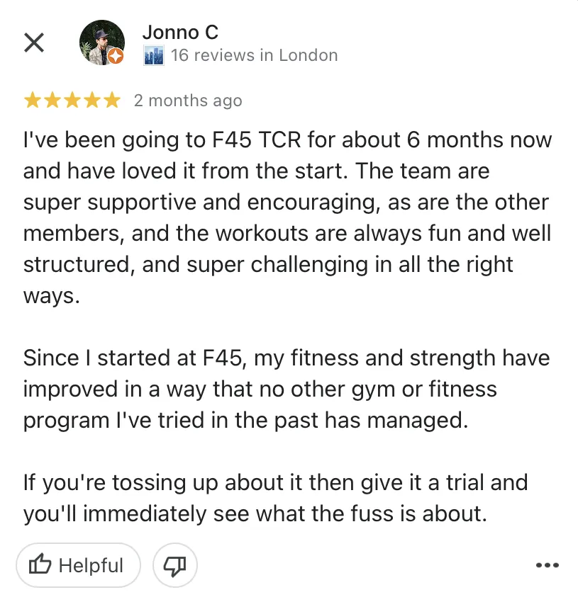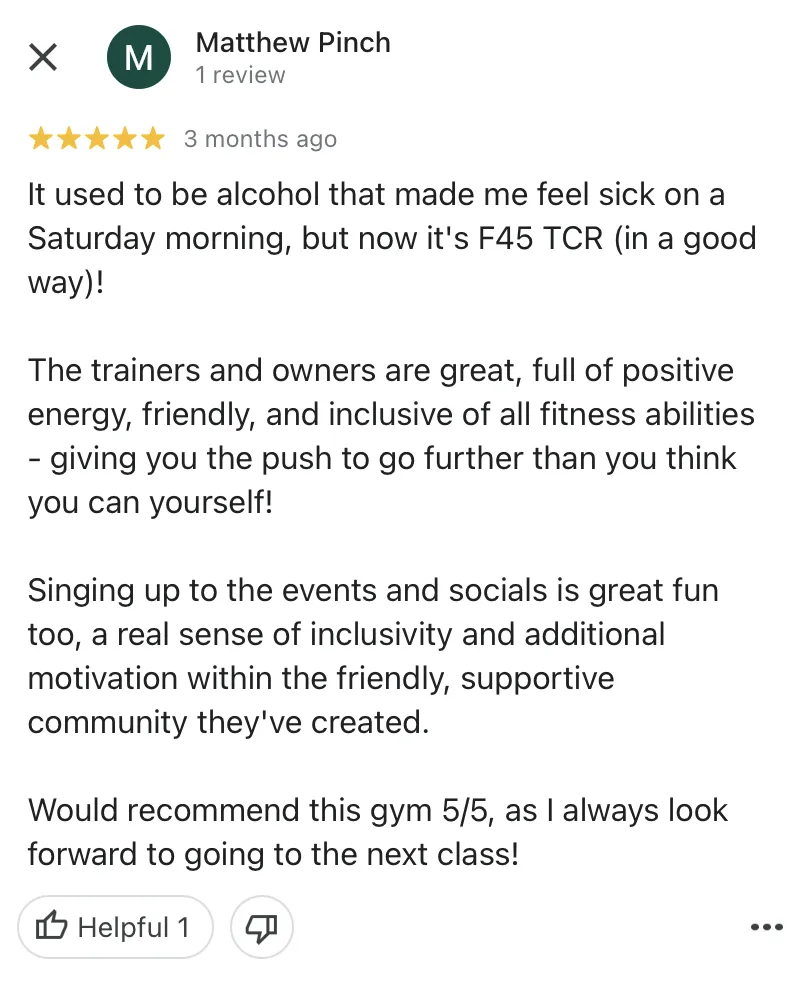 Whatever your level of fitness - whether you're a frequent gym bunny or complete fitness newbie, F45 was designed to get you RESULTS! And you'll leave every visit with a smile on your face!